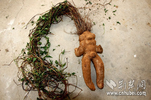 彭先生说,28日下午3点多钟,他在大悟亲戚家赶完礼以后,开着自家的小车沿243省道返回孝昌,当车行驶到大悟芳畈段时,发现一个扛着挖锄的老农,手里提着株根部酷似人形的植物,沿着公路边行走。彭先生停下车后,和该老农攀谈起来。老农说自己是芳畈镇某村的农民,今天到荒山上植树时,在一山岩处发现一兜很密集的藤蔓,有点像中药材,就将它挖了出来,结果就挖到这棵“人形何首乌”。