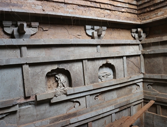其中,北面墙中间有一处龛室,龛室有高浮雕图像,图像清晰可见。东面墙有龛室两处,一处有砖刻高浮雕图像,人物图像勾勒细腻逼真,由于遭到破坏,无法看清人物着装,另外一处无浮雕,可能遭到破坏。西面墙同东面墙布局一样,有龛室两处,均有高浮雕图像。南边的图像已造到破坏,无法辨别,北边的浮雕图像完整,清晰可见。这些图像都是“二十四孝”故事。