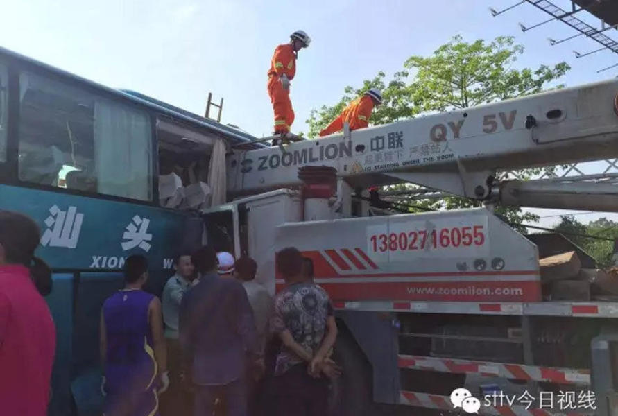 5月14日下午3时许,在汕头大学路广大实验学校路口发生一宗车祸,一辆载人大客车和一辆吊车发生碰撞,吊车吊臂拦腰插入大巴车身。汕头本地媒体称,事故造成大巴车上3名乘客以及吊车司机被困。经过消防官兵以及交警、120救护人员一个多小时的奋战,四名被困人员最终被成功解救下来。