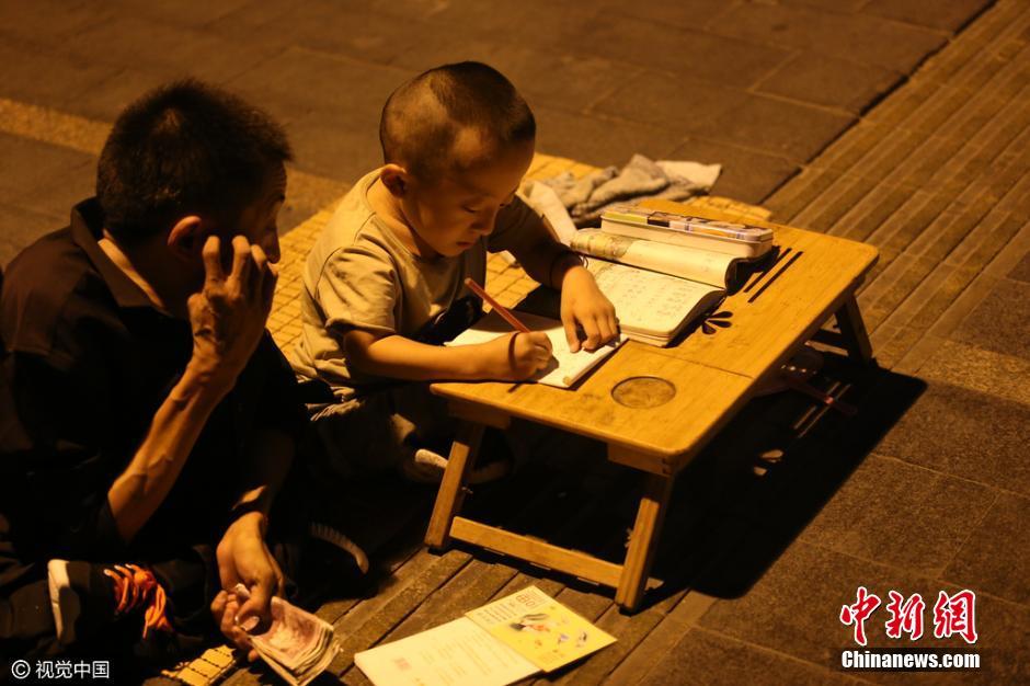 2016年07月11日,晚上8点,山东济南,洪家楼附近一位父亲与孩子坐在地上,父亲拿着一本破旧的书靠路灯教孩子读书写字,据了解父亲患有瓷娃娃病,孩子也患有瓷娃娃病。因为患病的关系,没有学校接收这样的孩子,父亲一边只能乞讨一边教孩子读书。7岁的孩子在父亲一边乞讨一边教子情况下孩子可以认识近100多个汉字。