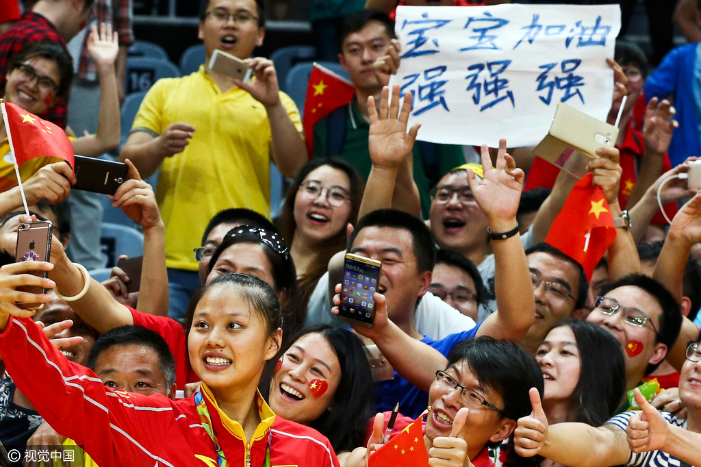 2016年8月20日,巴西里约热内卢,2016里约奥运会女排颁奖仪式举行,龚翔宇与粉丝自拍合影,球迷看台打标语抢镜。据悉球迷对女排队员张常宁的昵称为:宝宝。