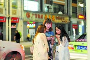 北京路步行街附近,使用软件网上约车的靓女焦急地等待车辆的到来。