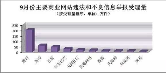 主要商业网站受理违法和不良信息有效举报230.9万件,处置或向执法部门转交215.4万件。其中,腾讯受理有效举报200.4万件(其中,微信107.6万件、QQ83.7万件、微博1万件、网站5.5万件),新浪受理有效举报16.8万件(其中,新浪微博12.6万件),百度受理有效举报11.7万件,阿里巴巴受理有效举报1.4万件,天涯社区受理有效举报1957件,凯迪网络受理有效举报717件,搜狐受理有效举报446件,优酷网受理有效举报376件,凤凰网受理有效举报75件,网易受理有效举报51件。
