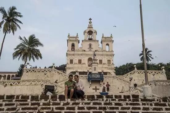 △印度果阿,游客在无原罪圣母教堂外的台阶上休息(图/新华社)