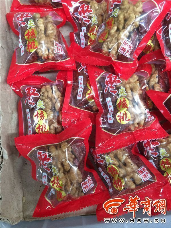 10月19日上午,在西安市胡家庙果品批发市场,工人们露天制作枣夹核桃,加工的食品未见清洗就装进精美的包装。经过包装显得“精美” 。