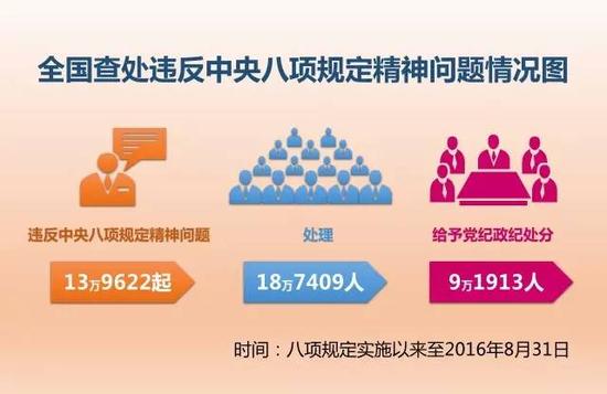 八项规定实施以来,截至2016年8月31日,全国已累计查处违反中央八项规定精神问题139622起、处理187409人,给予党纪政纪处分91913人。