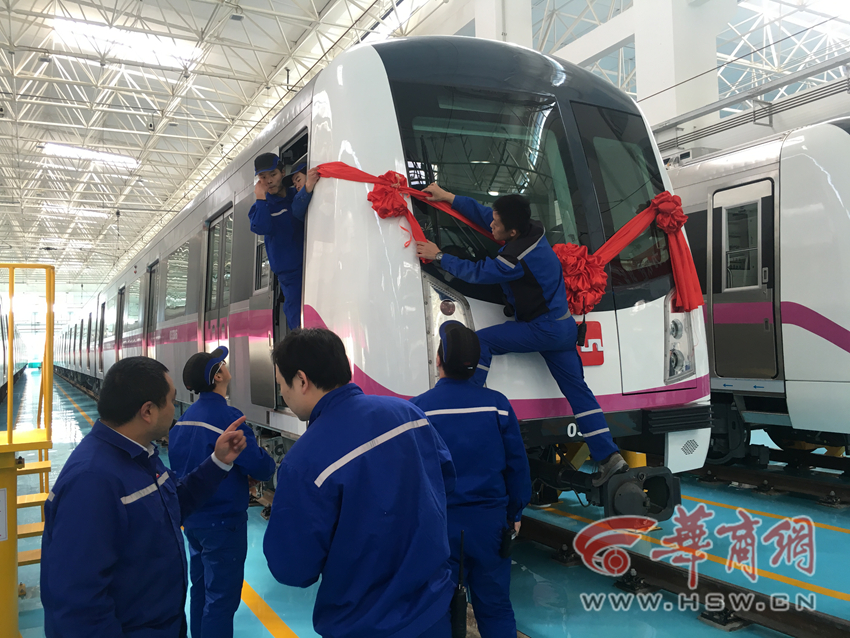 工作人员正在给始发车挂上红色的花缎,让它看起来更加特别和醒目一些。