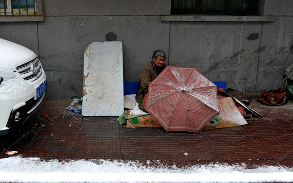 昨日风雪交加,雪花不停地往屋檐下钻,老人用几个纸壳板和一把伞遮挡自己的被褥,但效果甚微,纸壳板和周围的地上早已湿了大片。老人只露个花白头发的头顶在外面,看到有人过来,他马上坐了起来。面对询问,老人说他早就没有了家,这里就是他的家。而附近居住的人多数都知道这位老人,都说他在这里住了很长时间了……