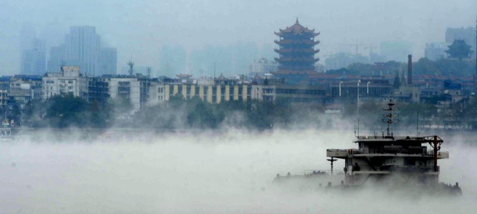2016年11月23日,湖北武汉,寒潮带来极速降温后,由于江水温度较大气温度高出不少,长江江面上出现层层水雾,烟波浩渺,蔚为壮观,放眼望去,仿佛整个城市都漂浮在云雾之中。吴铭 摄 图片来源:视觉中国