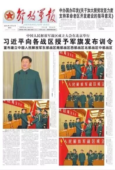 2016年2月1日,中国人民解放军战区成立大会在北京八一大楼隆重举行。中共中央总书记、国家主席、中央军委主席习近平向东部战区、南部战区、西部战区、北部战区、中部战区授予军旗并发布训令,强调建立东部战区、南部战区、西部战区、北部战区、中部战区,组建战区联合作战指挥机构,是党中央和中央军委着眼实现中国梦强军梦作出的战略决策,是全面实施改革强军战略的标志性举措,是构建我军联合作战体系的历史性进展,对确保我军能打仗、打胜仗,有效维护国家安全,具有重大而深远的意义。