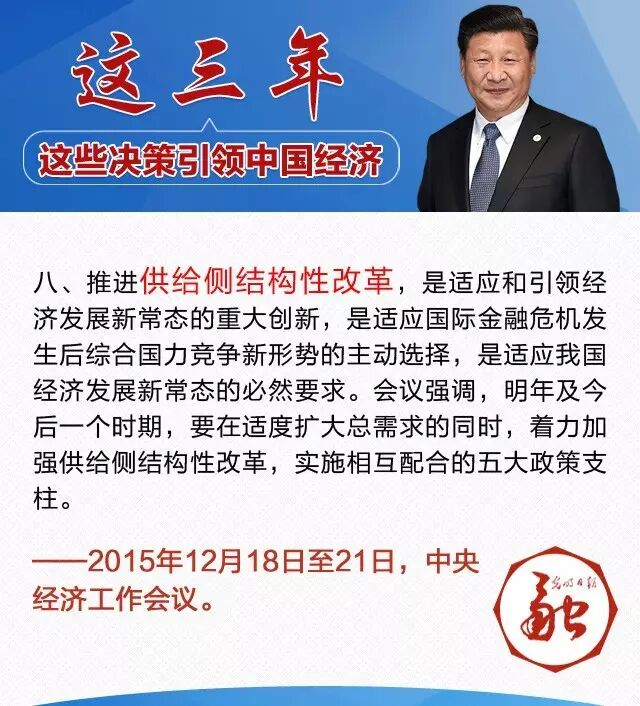 2013年12月10日,习近平在中央经济工作会议上说:“加强党对经济工作的领导,全面提高党领导经济工作水平,是坚持民主集中制的必然要求,也是我们政治制度的优势。党是总览全局、协调各方的,经济工作是中心工作,党的领导当然要在中心工作中得到充分体现,抓住了中心工作这个‘牛鼻子’,其他工作就可以更好展开。加强党对经济工作的领导,有利于思广益、凝聚共识,有利于调动各方、形成合力。”2016年中央经济工作会议召开之际,一起来看这三年,党中央是如何领导中国经济的?
