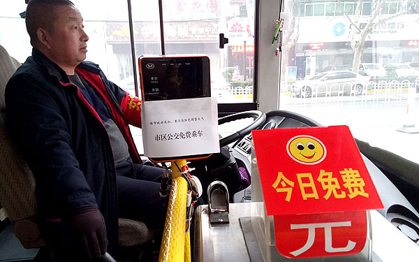昨日,咸阳城区公交车上的票箱口及刷卡机刷卡面板上分别贴着“今日免费”字样的提示牌 华商报记者 薛望 摄