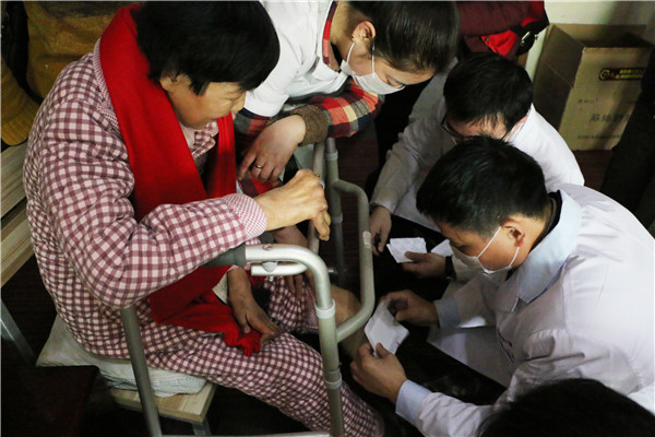 紧接着,工作人员还为常年患有风湿疾病的老人送去膏药,了解了老人们的患病史,并向长乐宫的工作人员说明了每位老人的患病位置,以及在日常生活中应该如何为老人缓减痛苦。