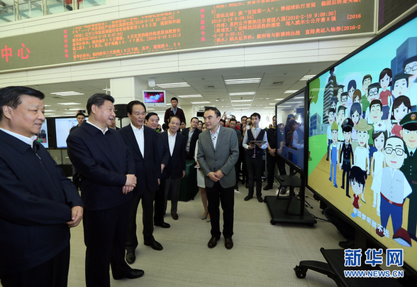 2016年2月19日,中共中央总书记、国家主席、中央军委主席习近平在北京主持召开党的新闻舆论工作座谈会,并到中央新闻单位调研。这是习近平在新华社观看新闻信息产品展示。新华社记者兰红光 摄