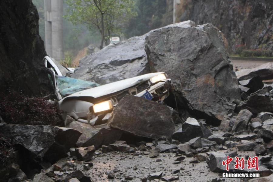 3月21日下午,福建省寿宁县竹管垅乡辖区省道302金鸡巢加油站附近发生山体溜方,一辆路过轿车被落石砸中,司机当场死亡。接到报警后,寿宁县公安消防大队官兵立即出动抢险救援车赴现场施救。欧宇帆 摄