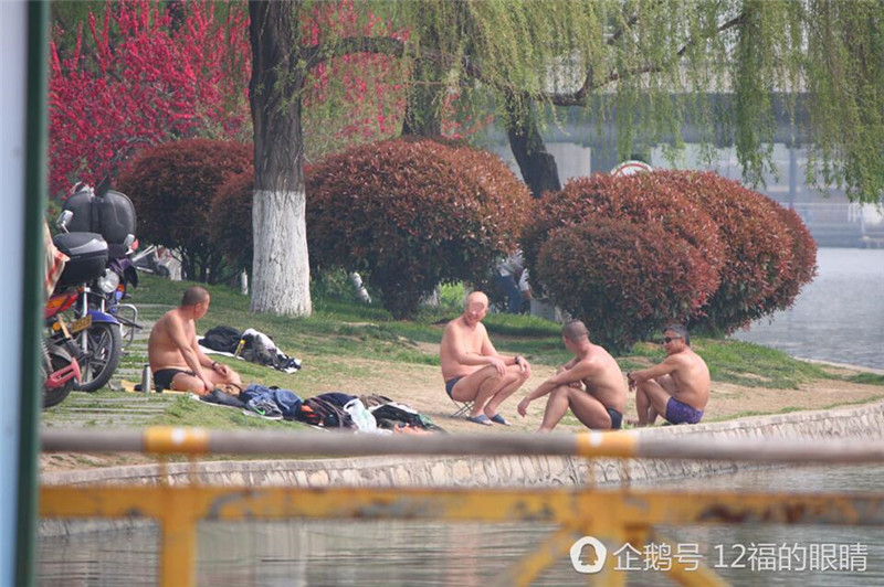 坐在岸边的野泳者光着身子,怡然自得地说笑。