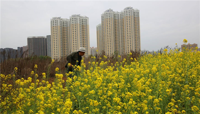 4月8日,西安青龙寺东面千亩废墟上,都市农夫们播种的油菜花盛开,一片片油菜花像散落在大地上的调色盘,将倒满建筑垃圾的废墟装扮得美丽动人。