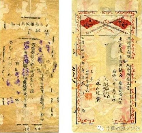 1930年7月,兴国县苏维埃政府开具的结婚证上,顶部两面交叉的红旗上有黑色的镰刀、斧头及五星图案。