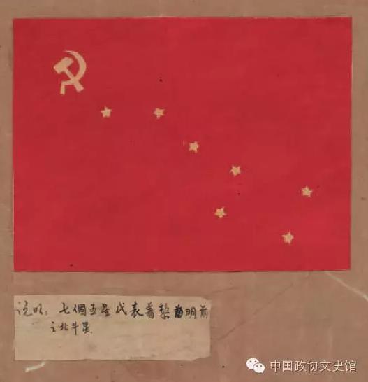 上面几张图选自中共七大期间征集到的230余幅党旗设计稿。在镰刀、斧/锤、红星等恒定元素之外,还有北斗七星、红缨枪、箭、锄头等中国元素。