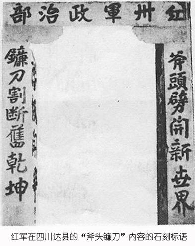 1933年9月,红三十军进驻四川达县梓桐乡,教书先生何永瑞父子因红旗上的镰刀斧头产生灵感,写出了震撼苏区的红色对联,被刻在红三十军政治部临时驻地的石朝门柱上。