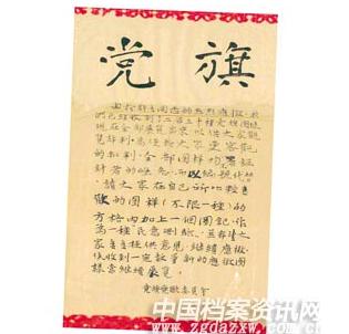 “一、中共党旗过去无正式规定,现正在拟制中;在未颁布前各地不要自行公布党旗格式尺寸及解释。二、群众自行悬挂中国人民解放军军旗或锤镰旗或青天白日满地红旗者,均听便……”