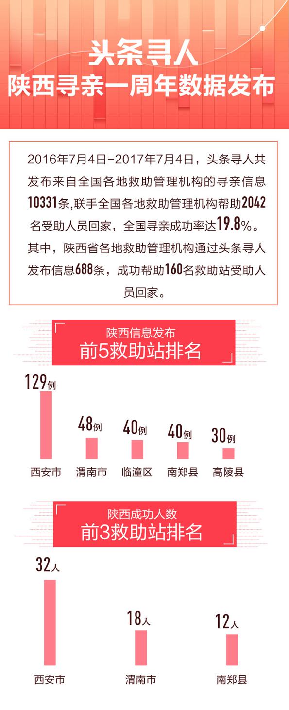 至今年7月4日,陕西省与今日头条合作开展互联网寻亲已一年有余。一年来,陕西省各地管理机构共通过头条寻人共发布寻亲信息688条,成功帮助160名受助人员回家。