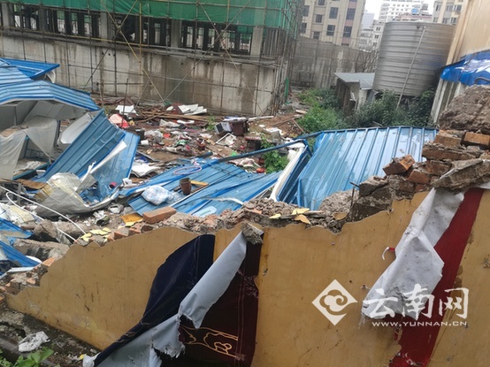 7月22日中午,云南网记者(微信公号:yunnancn)来到了位于巴士家园公交站附近的在建工地。在道路一旁,倒塌的几间蓝色活动板房十分显眼,土黄色的围墙已坍塌得只剩半米左右,砖块和遭到破坏的铝膜碎片混聚在一起显得一片狼藉,而房间内高低床、床褥、蚊帐、简易衣柜等生活用具仍然依稀可见。在活动板房一旁,是几间砖混的石棉瓦房,从外观来看并没有受到破坏。