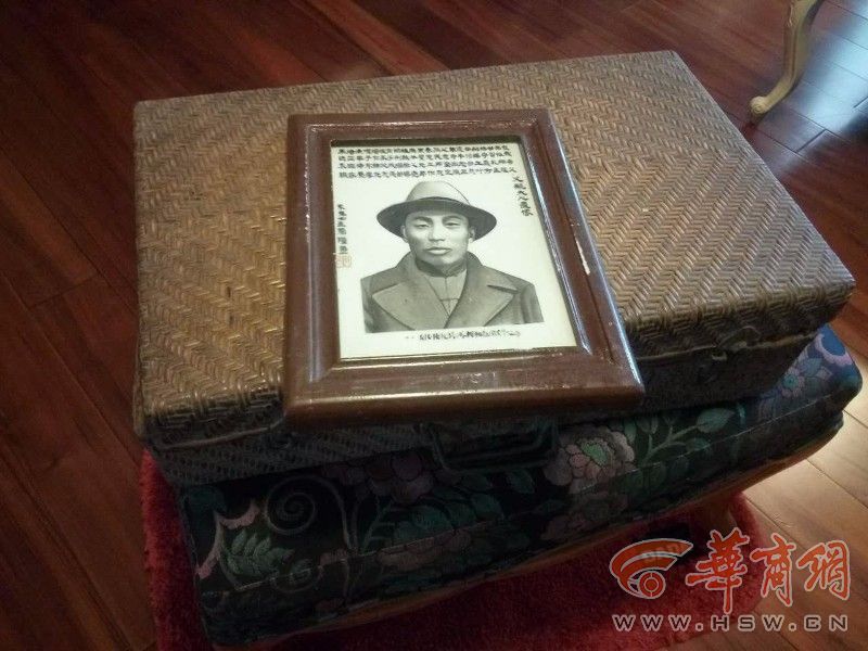 在客厅的凳子上摆着一只看起来很有年头的藤编手提箱。记者注意到,这只箱子外面是藤编,中间是木制骨架,里面用纸裱糊,里面放着烈士的画像等物。