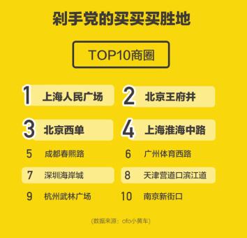 上海人民广场、北京王府井、北京西单、上海淮海中路、成都春熙路、广州体育西路、深圳海岸城、天津营道口滨江道、杭州武林广场、南京新街口,将成为共享单车出行最热的TOP10商圈,也是剁手党们最爱的买买买胜地。