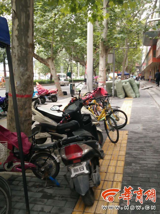 与长缨西路路北人行道相比,路南人行道占道情况好了很多。但在西安农械厂社区大门外,记者发现人行道上停放着数量摩托车和共享单车,不少车辆都直接压占盲道,此外,人行道上还堆放着七八个长2米,宽2米左右的大货包。