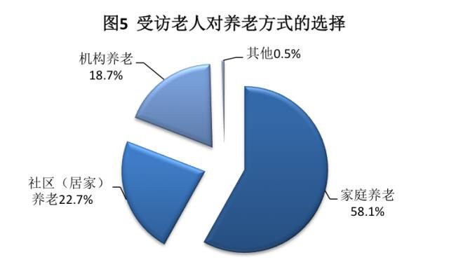 从养老方式看,家庭养老是受访老人首选的养老方式。调查结果显示,在养老方式的选择上,58.1%的受访老人选择家庭养老,22.7%选择社区(居家)养老,18.7%选择机构养老,还有0.5%的受访老人选择其他养老方式。