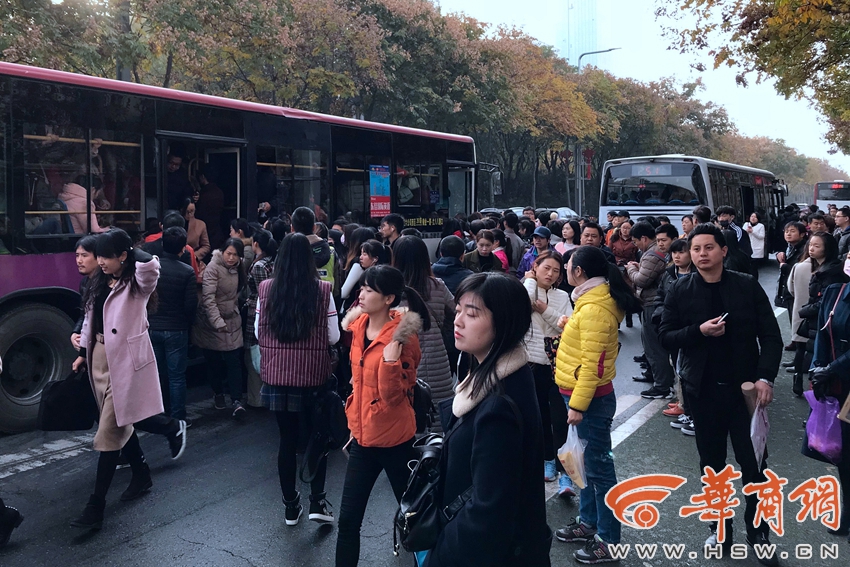 西安市沣惠南路公交站点,大量的乘客从地铁延平门站C1出口走出来换成公交车,有的乘客已经站在公交车道上等车。