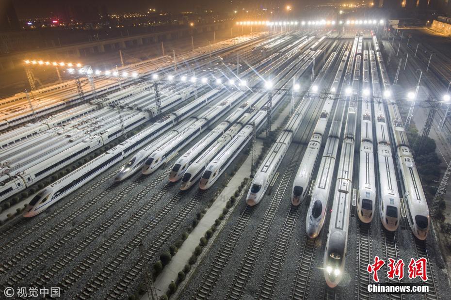 2017年12月5日夜,陕西西安,西安动车段存车线,一列列和谐号动车组整装待发迎接西成高铁的开通。2017年12月6日,中国首条穿越秦岭的高速铁路——西成高铁将全线开通。一立千年的栈道和一日千里的高铁,银龙呼啸一路穿山贯岭,陕川蜀道从此迈入高铁新时代。西成高铁自西安北站引出,向西南方向途经汉中、广元、绵阳、德阳接入成都东站,运营时速250公里每小时。12月6日至12月25日,第一次调图期间,每天将有18趟动车组列车往返于陕川之间。