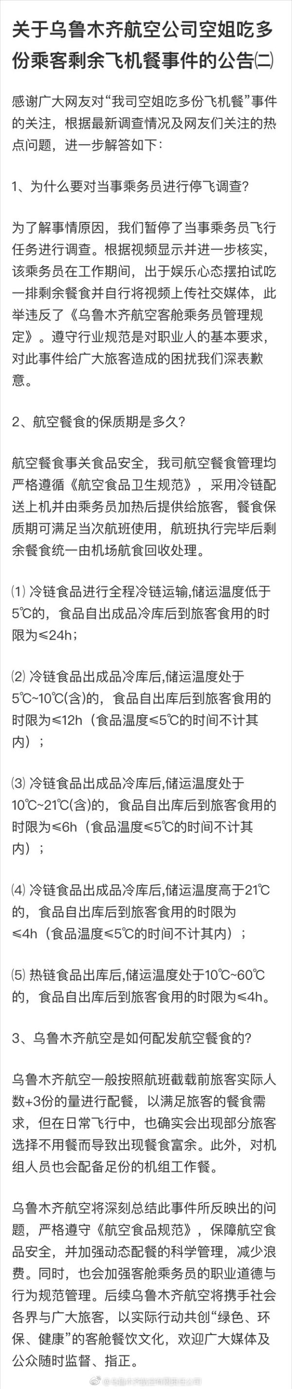 在这份公告中,乌鲁木齐航空公司对涉事乘务员为何被停飞接受调查,以及航空餐食保质期等问题进行了回应。公告称,根据进一步核实,涉事乘务员在工作期间,出于娱乐心态摆拍试吃一排剩余餐食并自行将视频上传社交媒体,此举违反了公司管理规定。