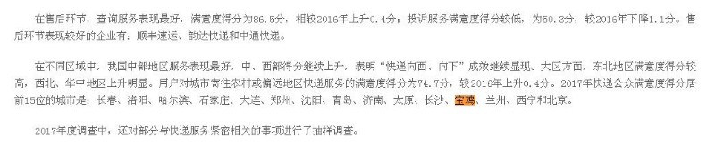 1月29日,国家邮政局发布了关于2017年快递服务满意度调查结果的通告,委托专业第三方于2017年对快递服务满意度进行了调查。调查范围覆盖50个城市,包括全部省会城市、直辖市以及19个快递业务量较大的重点城市,如北京、天津、上海、西安、宝鸡等。测试对象为2016年国内快递业务总量排名靠前且服务水平较好的10家全网型快递服务品牌。调查由2017年使用过快递服务的用户对受理、揽收、投递和售后4个快递服务环节及16项基本指标进行满意度评价,通过计算机辅助电话访问和在线调查等方式,获得有效样本85501个。