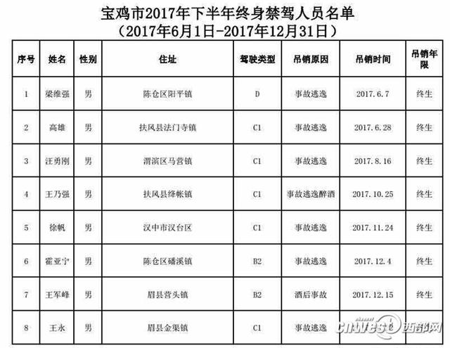 宝鸡市公布2017年下半年终身禁驾人员名单。