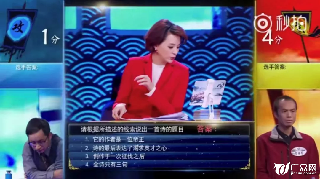 关键的最后一题,是根据主持人所给出的线索,说出一首诗的题目。这一题,董卿才说道:“作者是一位帝王,诗的最后表达了对英才的渴求之心”,魏敏又急了,按完铃之后,一副自信满满的样子说,“这是《短歌行》。”这下,评委们都看不过去了,“曹操是帝王吗?”但是,已经无法挽回了,他又送了一分给雷海为。就这样,雷海为率先拿到5分,成功夺冠。其实这道题的正确答案是《大风歌》。