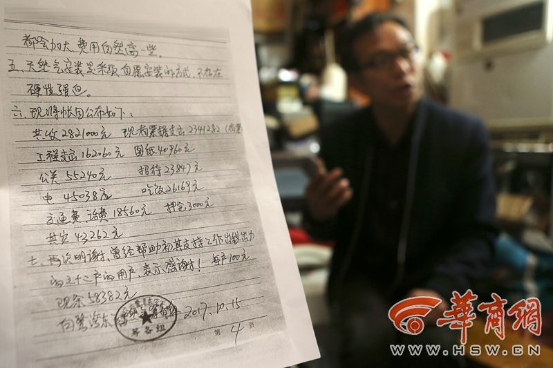 华商报记者看到,情况说明中公布的账目显示:共收2821000元,现有票据支出2341282元(有票据),工程支出162060元,图纸40960元,公关55240元,招待23847元,电45038元,吃饭26169元,交通费、话费18560元,押金3000元,其他43262元……