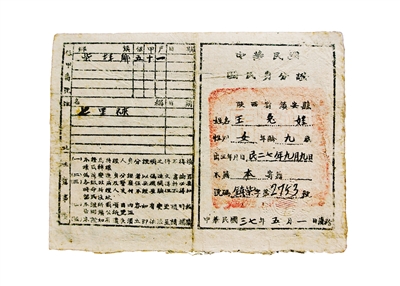 1946年,民国政府公布《户籍法》,规定制发国民身份证,发证对象是18岁以上的国民,不分男女;未满18岁,自动请求者也可准予发给。这张身份证的颁证日期为1948年5月1日,那时太奶奶只有九岁,还在读小学一年级。身份证长16厘米,宽12厘米,共2页,单面对折印制,整体白底黑字。第一页右半部分为封面,第一、二行宋体字印有 “中华民国国民身份证”字样,第三行起依次为“陕西省镇安县、姓名、性别、出生年月日、本籍、寄籍和号码”等项,正中还有红色大方印章(字迹不详),最下一行落款为“中华民国三七年五月一日发给”;第一页左半部分为表格样式,包括“保甲番号、住址、注意事项”,其中保甲番号包括“乡镇、保、甲、户”等编号。第二页左半部分表格分别包括“教育程度、职业、公职候选人资格、特征”等项目,其中特征中除了盖有指印外,还对双手十指上的“箕、斗”纹分别用“×”“○”进行了标记,在照片或标准指纹一栏还有圆形钢印(镇安×× 国民身份证),右半部分表格自上而下依次分别为“公民资格、家属、役历”等项,其中“家属”项目中对其亲属关系包括“父、母,姊”均有详细记载,兼具有现在身份证和户口簿的作用。