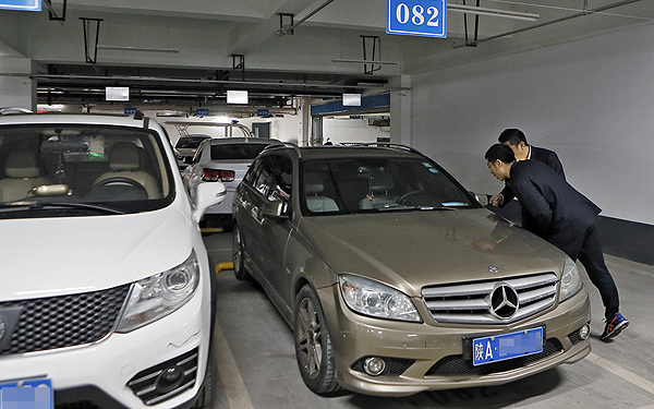 曲江一保障性住房小区地下车库停放着奔驰轿车,物业工作人员根据车上留的电话联系车主将车驶离车库 华商报记者 张杰 摄 文 陈思存
