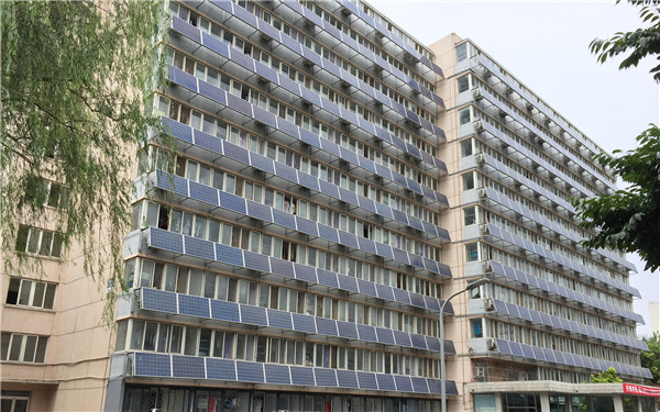 2018年6月9日,北京交通大学一男生宿舍楼外墙“爬满”太阳能板,采用创新项目:外墙分布式光伏+储能缓解用电超负荷,不仅可以改善和美化建筑外观,同时还能发电,并起到很好的科普宣传效果。