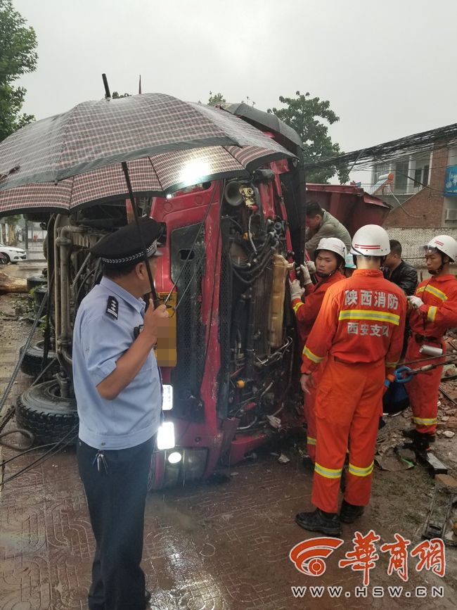 公安临潼分局交警大队事故中队副中队长茹鹏程说,这是一辆前四后八的重型自卸货车(自重20吨左右),来自西安浐灞。当时,34岁的男子马某驾驶该车由南向北高速行驶,因雨天路滑、视线不好、对路况不熟等因素,马某猛踩刹车,采取紧急制动措施不力,导致该车失控,冲出道路,先是撞倒一棵树又连续将两根电杆撞倒,最后撞上民宅院子围墙,一大片围墙被撞倒,大货车侧翻在地,驾驶室扭曲变形,司机被卡。
