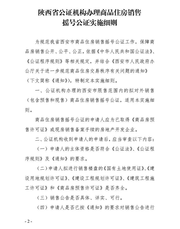 7月6日,陕西省公证协会发布关于印发《陕西省公证机构办理商品住房销售摇号公证实施细则》的通知。具体内容如下: