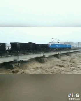 90后司机迎着洪水开火车压桥