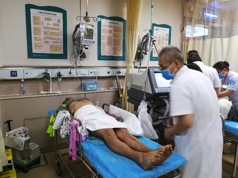 7月19日下午4时许,在西安医学院第一附属医院急诊科,医生正忙着抢救一位严重的热射病男性患者,紧急进行降温、补液等处理,患者仍处于昏迷中,肾功能已经出现了问题。据工友介绍,患者50岁,在斗门一家建筑工地干活,11点钟下班准备休息了,却突然意识不清倒地,体温非常高,还有抽搐、大小便失禁等症状,工友们急忙将其送到王寺一家医院,由于病情危重,又转到上级医院。