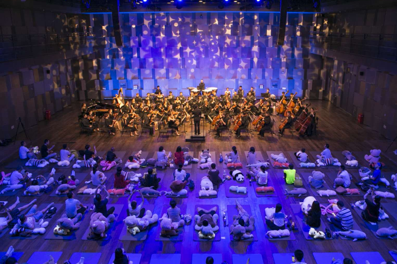 无数的星星营造出了一个梦幻的星空,八十张瑜伽垫整整齐齐铺在地板上,瑜伽垫上,一大一小柔软厚实的公仔正憨态可掬地等待着他们。这就是西安交响乐团的“睡觉音乐会”。不同于以往古典音乐会对观众“正襟危坐”、“以掌声和礼仪表达对乐队的尊重”的要求,在演出开始前,乐团负责人就特地告知大家:请彻底放松,享受音乐和睡眠,不必鼓掌以免惊醒他人。