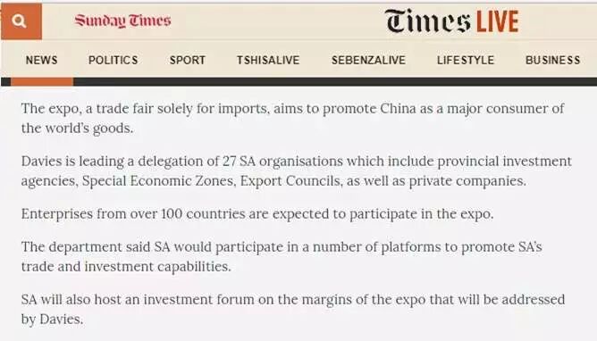 南非《星期日时报》报道了南非贸易和工业部长戴维斯率团参加中国国际进口博览会的情况。报道说,这一盛会将进一步推动中国与世界各国的经贸往来。