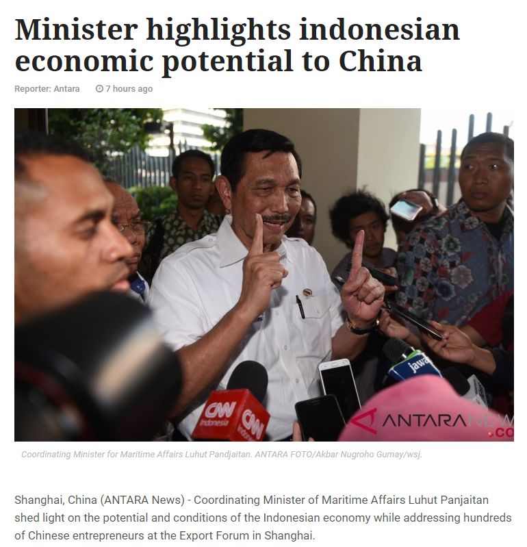印尼官方通讯社——安塔拉通讯社6日以《部长强调印尼对华经济潜力》为题报道了这次盛会。文章说,印尼海洋事务统筹部长卢胡特在上海表示,虽然中国在诸多领域已是印尼的主要贸易伙伴,但两国还有不少其他领域可以合作。