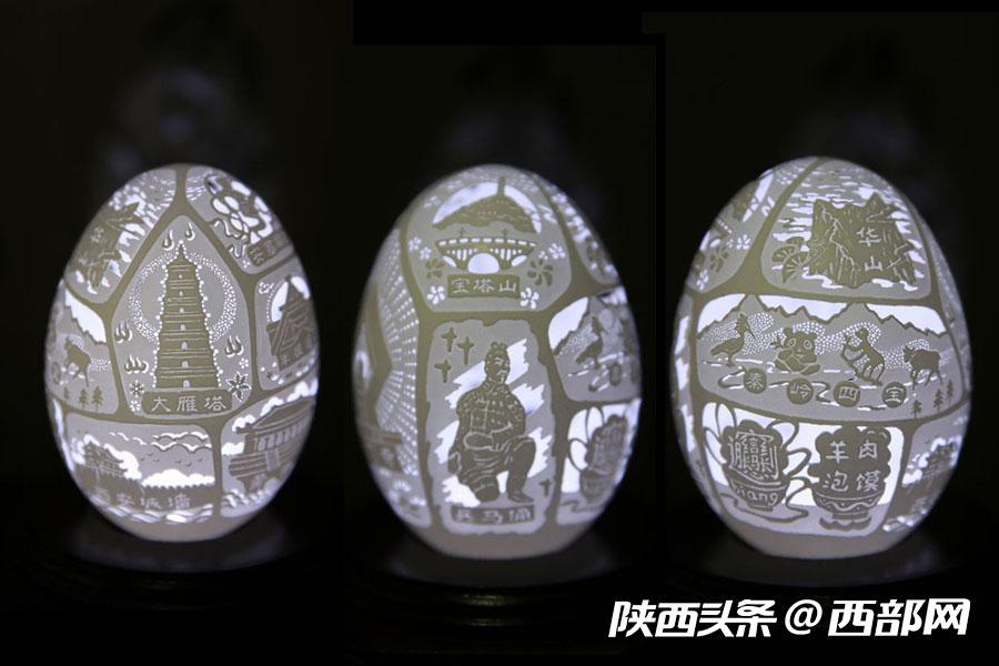 蛋雕《三秦美》。小小的鹅蛋壳上刻上了大雁塔、兵马俑、华山、宝塔山、秦岭四宝、羊肉泡馍等最能代表陕西的元素。2012年闻福良的蛋雕作品获得中国工艺美术百花奖金奖,这是这个行业的最高奖。