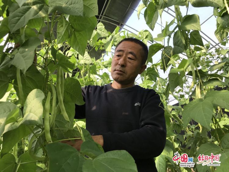 李国义正在温室大棚里查看豆角的长势。贺冬鹏/摄